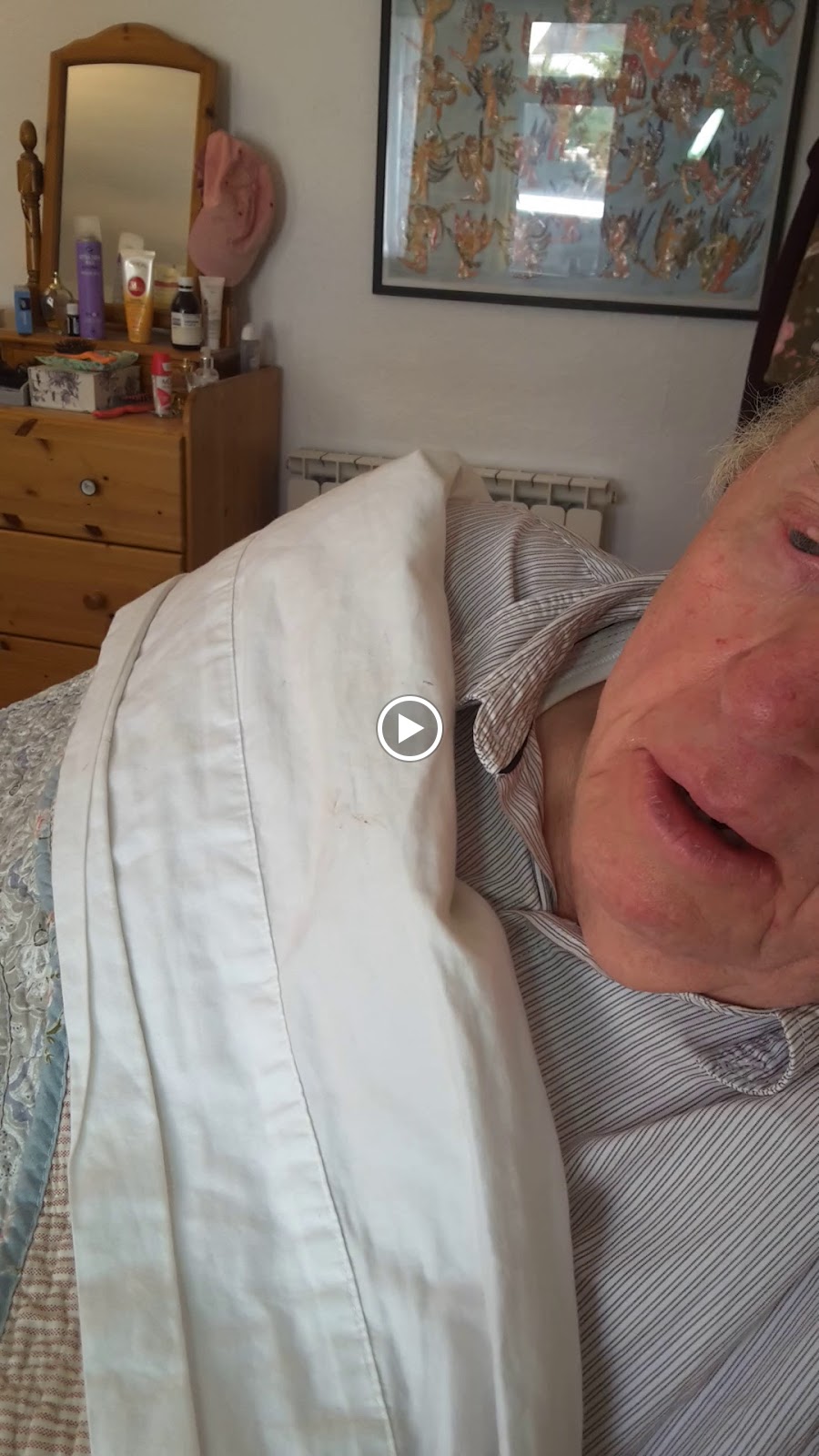 8.30.AM. Blue sky with patchy cloud also wind, no sunshine yet. Cool in the bed room. Edward up. He is pain free at present. My hair colour is dark blond. I will have to get used to the colour. A wonderful very hot day. Edward is in bad mood; I felt tired and sad that Anne's last day is tomorrow. Lucy is very sun burned, her baby bump has grown. Edward is eating most of the day. He is aggressive and wants attention all the time. I feel so tired. When ever I feel relaxed for a little while it is so very good. I have felt some peacefulness this week with Anne and Lucy, Edward always steals my peace. I long to feel peacefulness but Edward always disturbs me. He cant let me rest. I want to rest and dream without aggression and stress, I feel so tired. I long for a cigarette of two... I am having to swallow hay fever tablets every day for my stuffed up runny nose.
